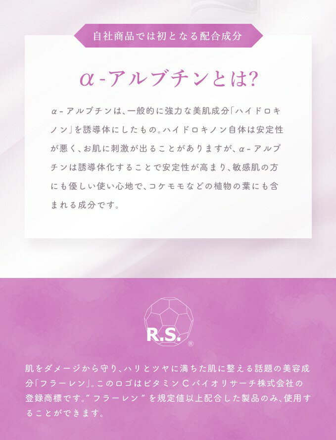 全成分 水、グリセリン、プロパンジオール、ペンチレングリコール、パルミチン酸アスコルビルリン酸3Na、フラーレン、α-アルブチン、シロキクラゲ多糖体、ヒアルロン酸Na、グリチルリチン酸2K、ツボクサエキス、オウゴン根エキス、イタドリ根エキス、カンゾウ根エキス、チャ葉エキス、ローズマリー葉エキス、カミツレ花エキス、BG、エチルヘキシルグリセリン、PVP、ピロ亜硫酸Na、フェノキシエタノール 生産国 日本(Made in Japan) 備考 本商品は食べものではありません。