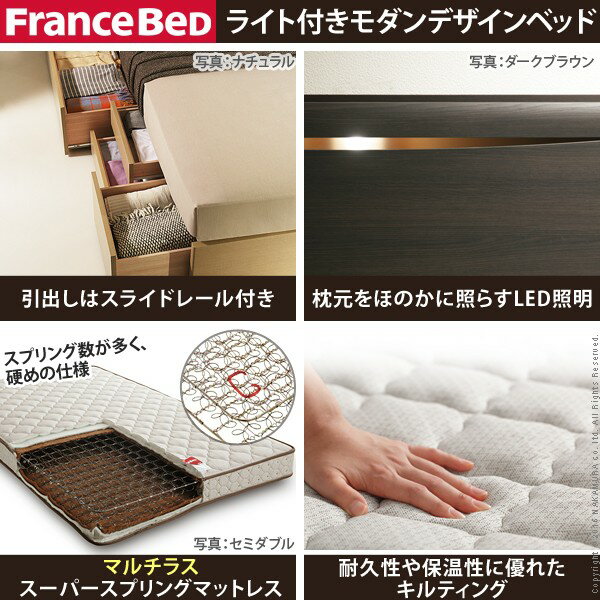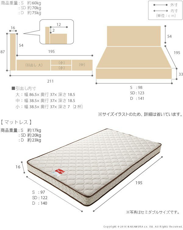 ●メーカー2年保証 【セット構成】ベッドx1・マットレスx1 【カラー】ダークブラウン・ミディアムブラウン・ナチュラル 【仕様】 ■ベッド 本体:プリント紙化粧合板 床板:布張り 引出し:スライドレール コンセント:1口1500W コード長さ:約1.7m 照明:LED0.2W ◎組立品 ■マットレス 張地:ポリエステル64%、綿27%、レーヨン9% 中身:ウレタンフォーム、パームパッド、ポリエステル綿、防虫不織布 コイル:マルチラススーパースプリング 【サイズ】 ■ベッド 外寸:幅98x奥行211x高さ87cm/約60kg 床面高さ:33cm 床面サイズ:幅98x奥行195cm 宮奥行:16cm 宮上有効サイズ:幅97.5x奥行12cm 引出内寸(大):幅86.5x奥行37x高さ18.5cm 引出内寸(中):幅38.5x奥行37x高さ18.5cm 引出内寸(小):幅38.5x奥行37x高さ7cm(x2杯) ■マットレス 外寸:幅97x奥行195x高さ16cm/約17kg 株式会社ナカムラ(I-4700329)